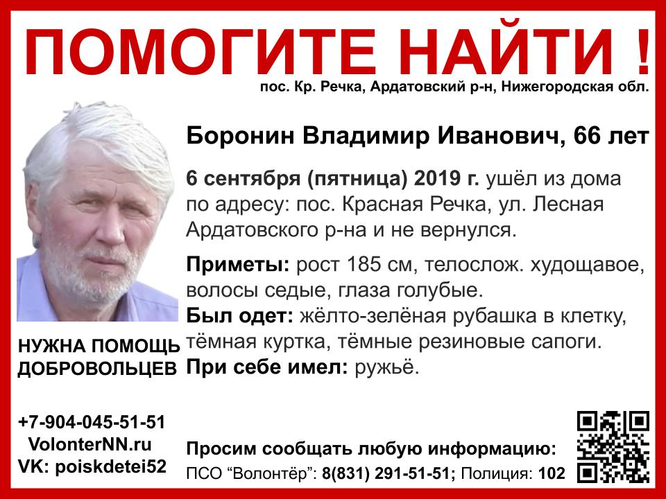 Согласно информации, 66-летний Владимир Боронин пропал в пятницу, 6 сентября, уйдя из дома в посёлке Красная речка в Ардатовском райне.