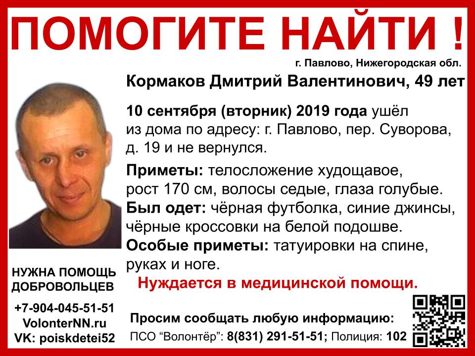 10 сентября 2019 года он ушёл из дома по адресу: г. Павлово, пер. Суворова, 19 и не вернулся. Нуждается в медицинской помощи.
