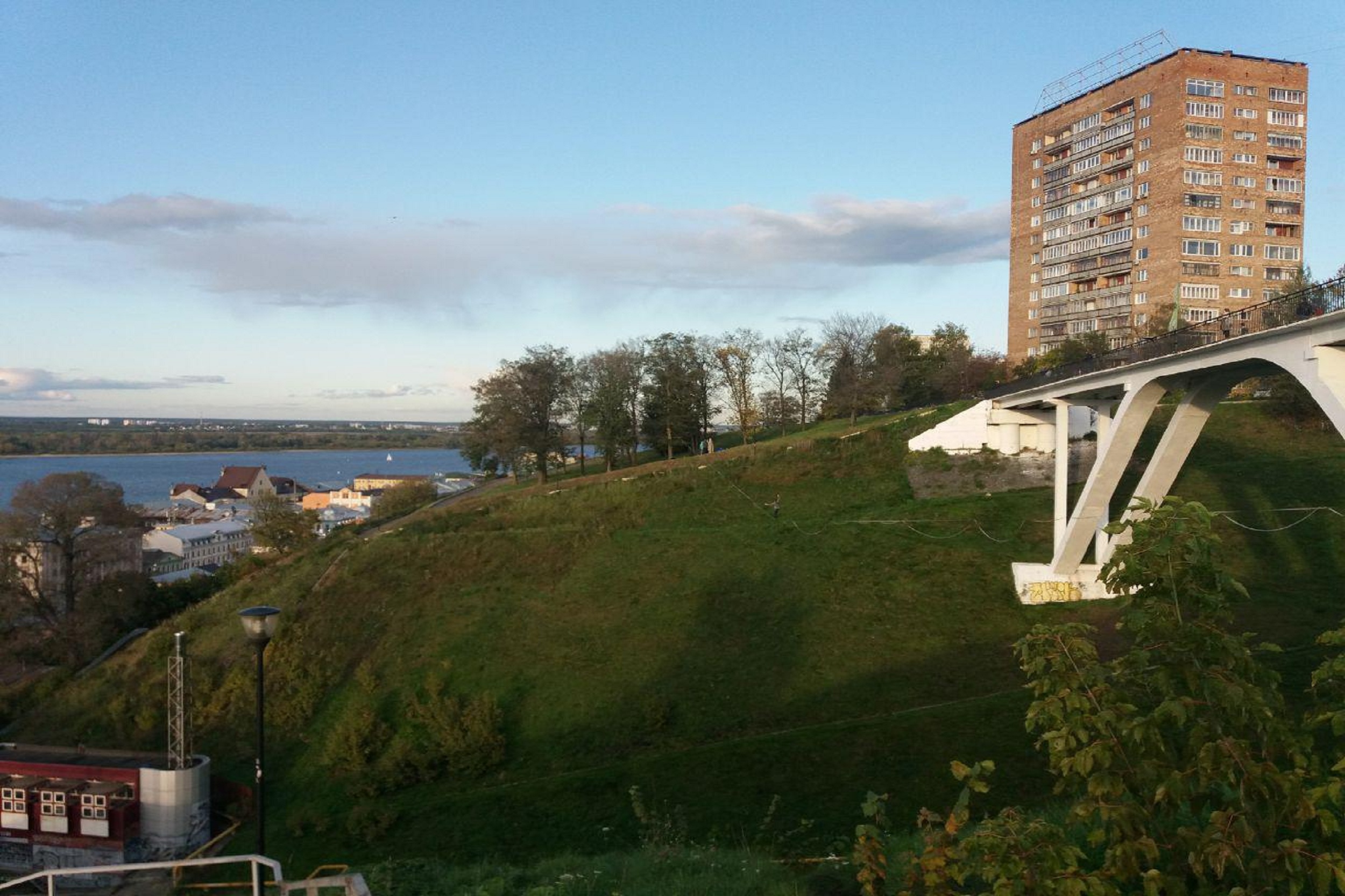 Девушка-канатоходец (слэклайнер), пересекающая "Почтовый съезд" в Нижнем Новгороде 15 сентября, сорвалась с троса, но поддерживаемая страховкой, мгновенно вернулась на стропу.