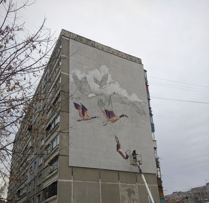 Граффити "Полет к мечте" создают на фасаде 9-этажного дома № 33 по ул.Комсомольской в Автозаводском районе.