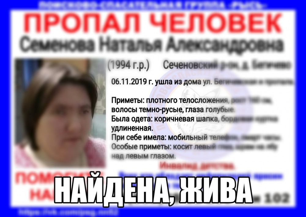 Пропавшая неделю назад в Сеченовском районе Нижегородской области 25-летняя Наталья Семенова найдена живой. Об этом сообщает поисково-спасательный центр "Рысь".