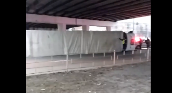 Происшествие произошло утром 27 ноября, когда 26-летний водитель фуры не справился с управлением в результате чего полуприцеп машины задними колесами наехал на бордюр. Фура (видео из соцсети) опрокинулась на проезжую часть, перекрыв движение.