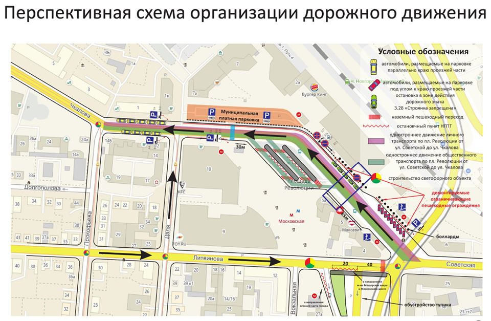 Одностороннее движение в обратном направлении (в сторону улицы Советской, Канавинского моста) предложено организовать по улице Литвинова. Остановку общественного транспорта в этом направлении разместят под метромостом.