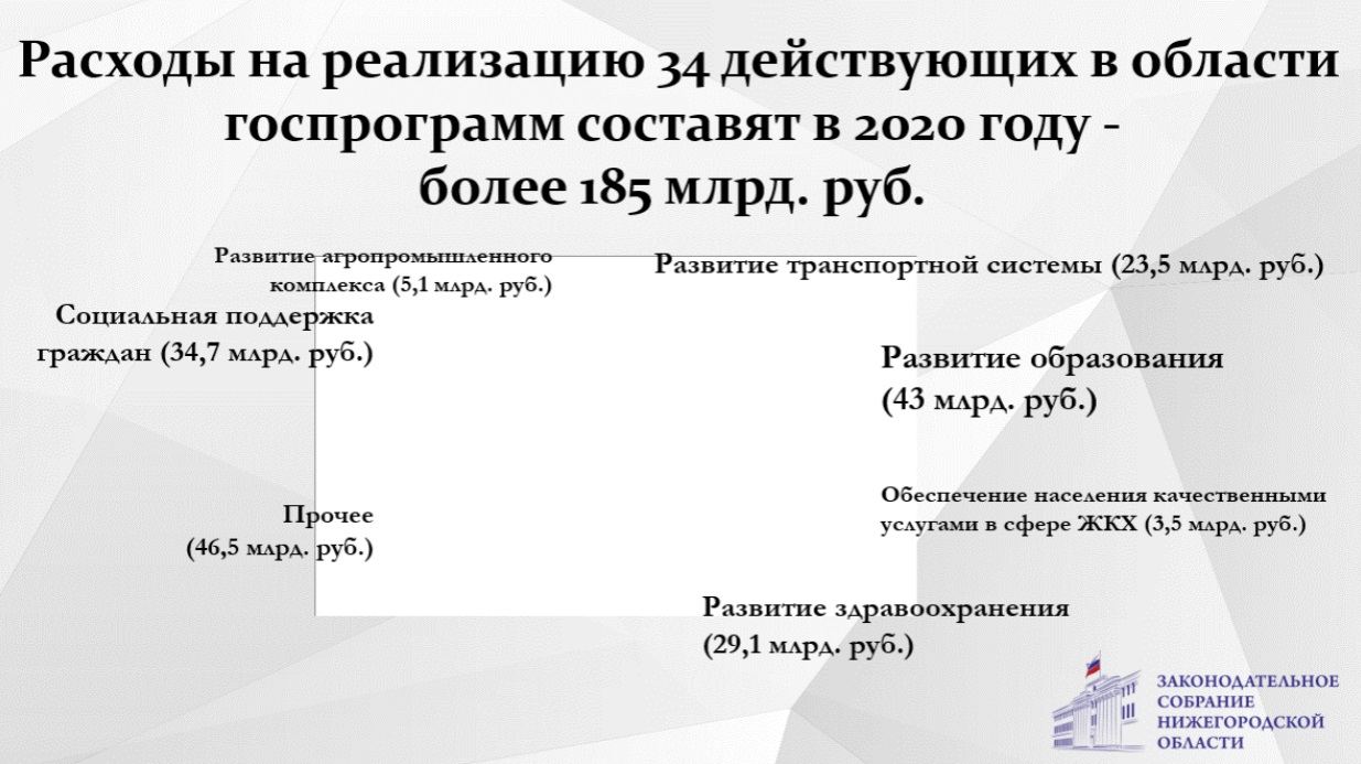 Расходы областного бюджета на 2020 год и на плановый период 2021 и 2022 годов сформированы в программном формате на основе 34 государственных программ Нижегородской области.
