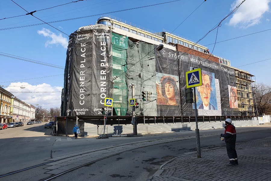 Она размещена на фасаде строящегося на месте бывшего Дома крестьянина бизнес-центра на пересечении улиц Пискунова и Алексеевской.