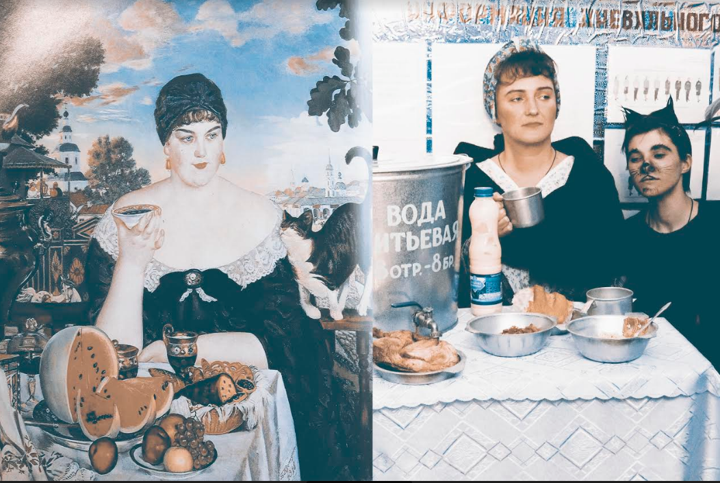 Одна заключенная примерила на себя образ купчихи с известной картины Бориса Кустодиева. Только вместо изысканной чашки с чаем у нее в руках оказалась железная кружка, а на столе у нее - яства, которые подают в колонии. Другая девушка изобразила кота, который ласкается к купчихе.