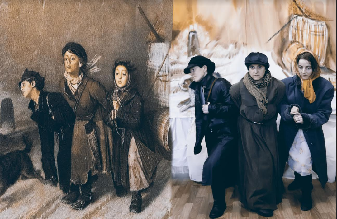 Так одна из осужденных девушек примерила на себя образ с картины Виктора Васнецова "Алёнушка". Она приняла задумчиво печальную позу, сидя на импровизированном камне, а сзади нее возвышаются нарисованные на белом полотне деревья.
