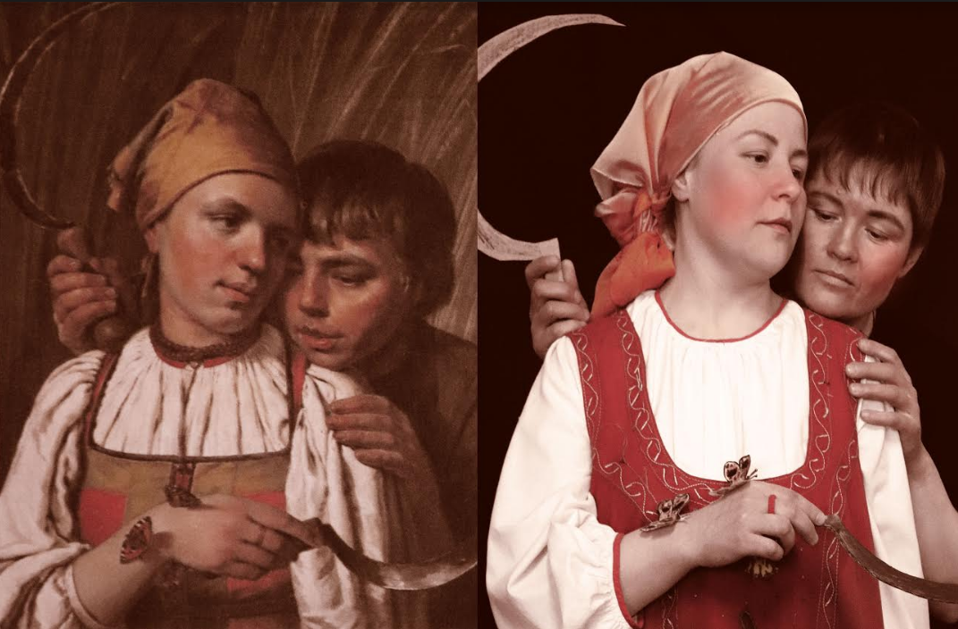 Еще две женщины изобразили картину "Жнецы" Алексея Венецианова, повторив внешний облик героев картины. На ней, также как на оригинале, присутствуют бабочки.