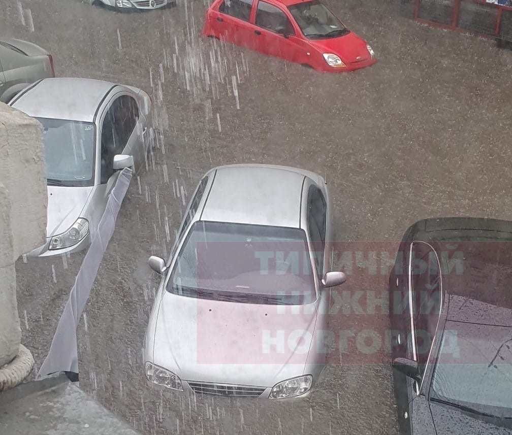 На фотографиях видно, что уровень воды на улицах достигает середины дверки автомобиля. Городские ливневки не справляются.