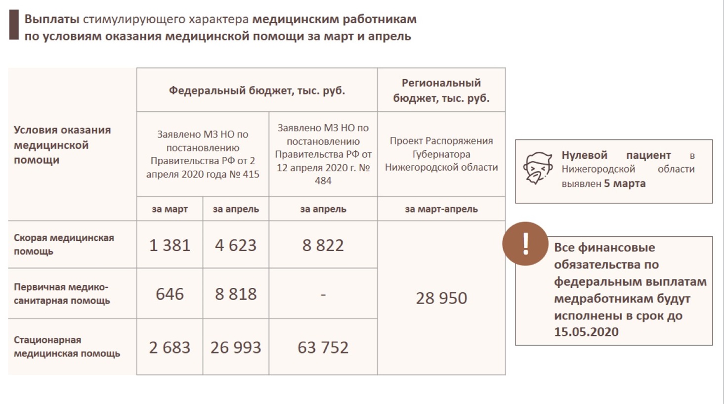 Напомним, что на федеральном уровне принято решение выплатить дополнительные средства всем медицинским работникам, которые контактируют с больными COVID-19. Нижегородские медики получат надбавки за работу с больными коронавирусом до 15 мая.