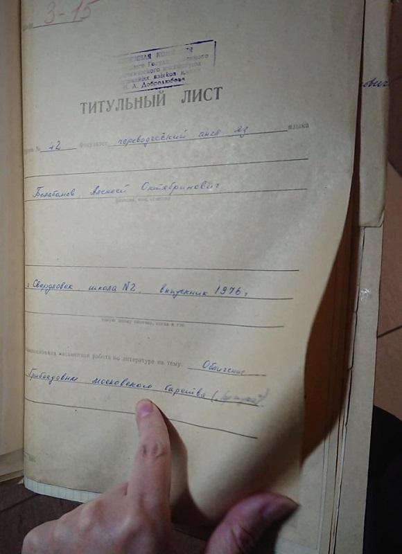 В ходе встречи было продемонстрировано личное дело студента иняза Алексея Балабанова. В досье - характеристика студента, студенческий билет, сочинение Алексея Балабанова, которое он написал на экзамене по литературе, поступая в 1976 году на переводческий факультет НГЛУ. Тема сочинения - "Обличение Грибоедовым московского барства" по поэме А.С.Грибоедова "Горе от ума".