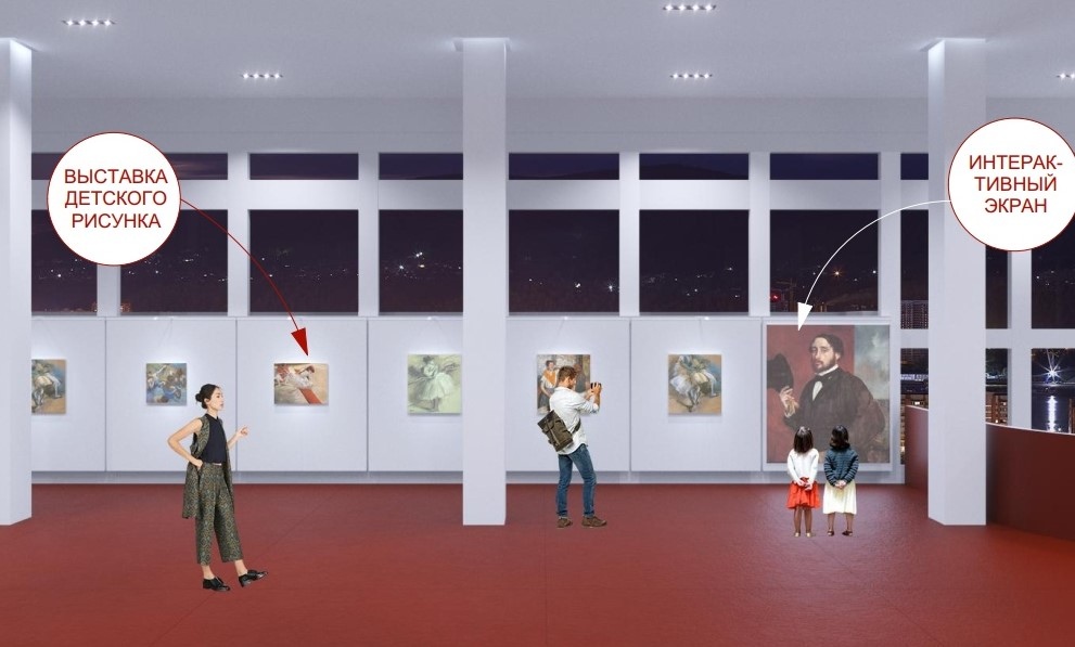 (дизайн-проект, фото из соцсети ВКонтакте, ТЮЗ)Вдоль стены предлагается разместить выставку детского рисунка и интерактивный экран.