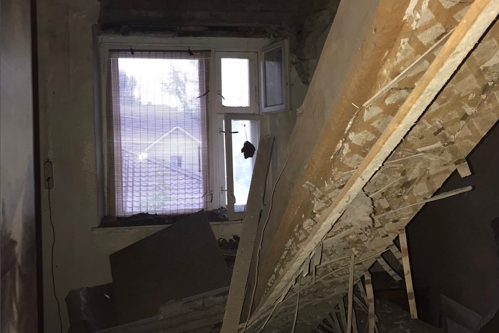 На месте установлено, что "произошло обрушение балки перекрытия, потолка и нарушение целостности стропильной системы".