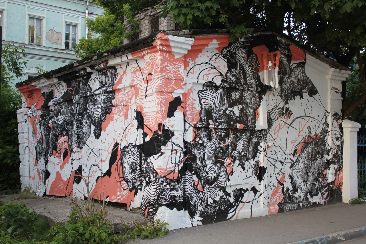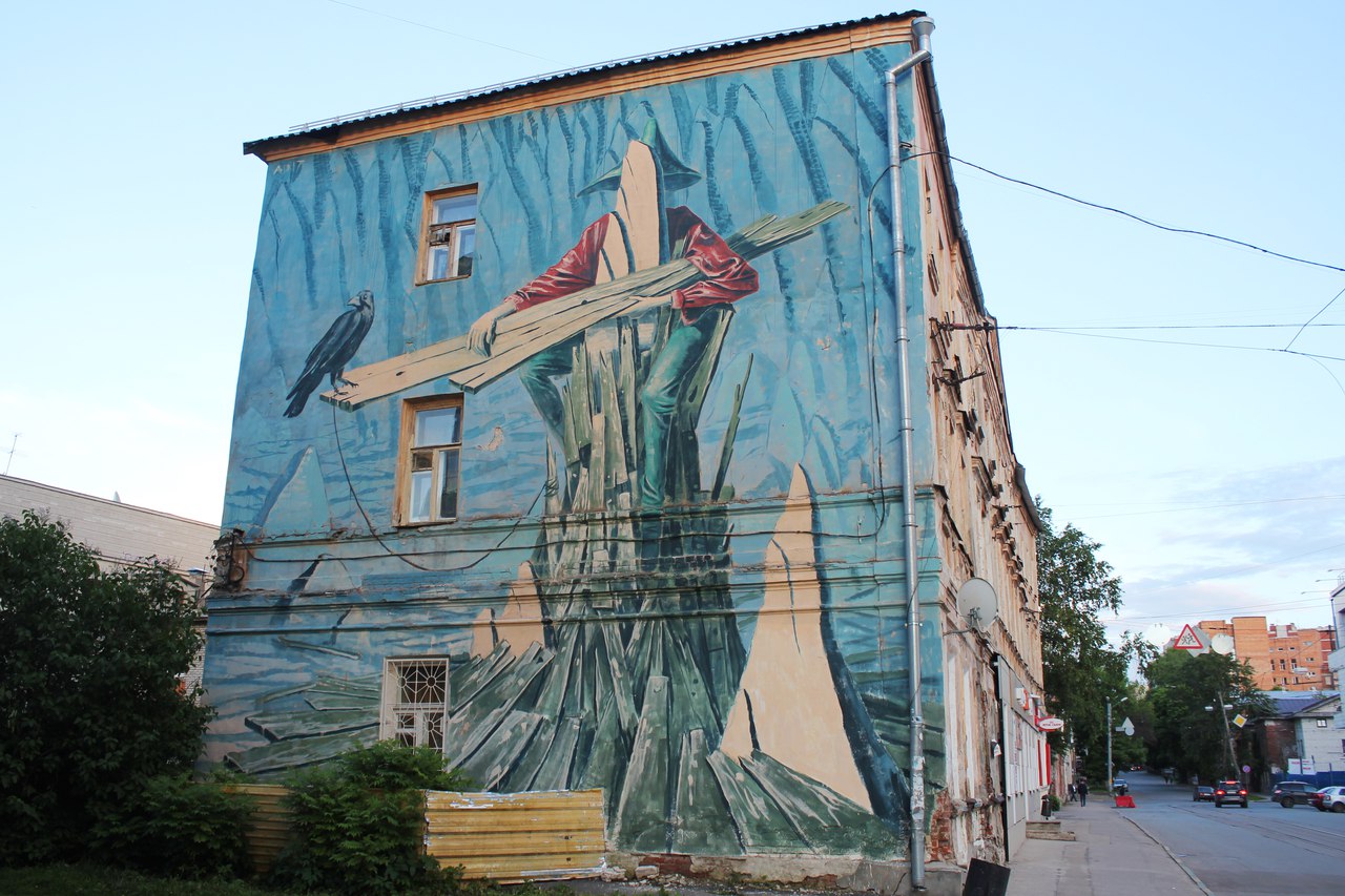 (Работа Андрея Оленева (Нижний Новгород) на фестивале в 2019 году, Ул. Ошарская, 8)12:00-13:30 — Стрит-арт экскурсия с Лидой Birdly + интерактив с постерами (регистрация с 18 августа);