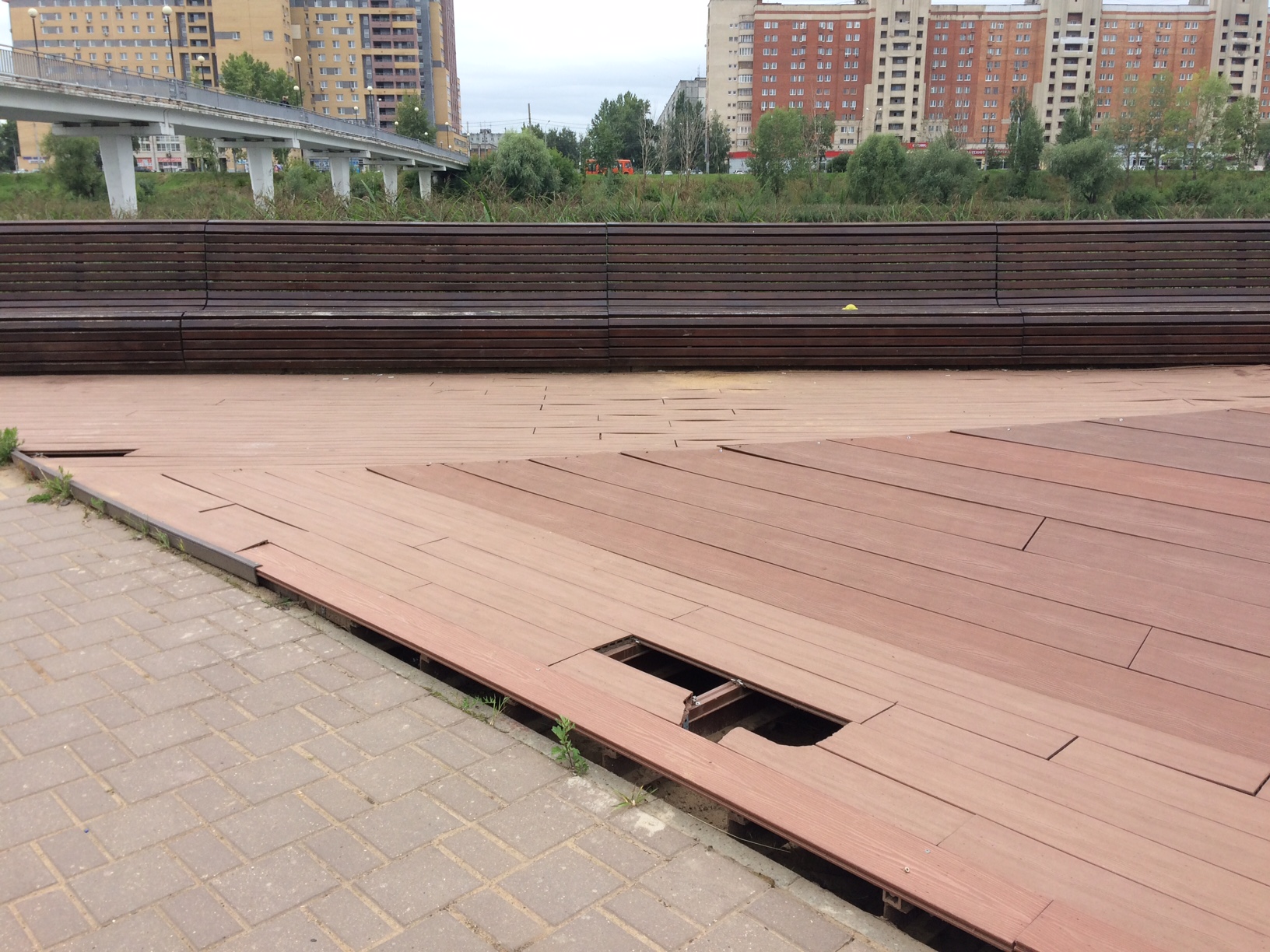 Ранее, в ходе проверки были выявлены следующие недостатки: повреждение покрытия настила, повреждение покрытия пирамид, частичное разрушение декоративных камней, отсутствие крепежных элементов на покрытии пола из пластиковых досок и иные недостатки.