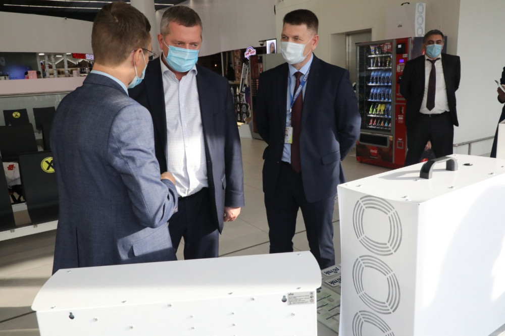 "В аэропорту установлено 5 рециркуляторов воздуха, которые обеспечивают принудительную циркуляцию воздуха в помещении и одновременно обеззараживают его ультрафиолетом в закрытой камере. Специальное стекло бактерицидных ламп исключает образование озона. Рециркуляторы интегрированы в систему Интернета вещей, аналогичную "умному дому" и могут корректировать свою работу, автоматически подстраиваться под другие приборы, обеспечивающие комфорт посетителей аэропорта", - рассказал Максим Черкасов.