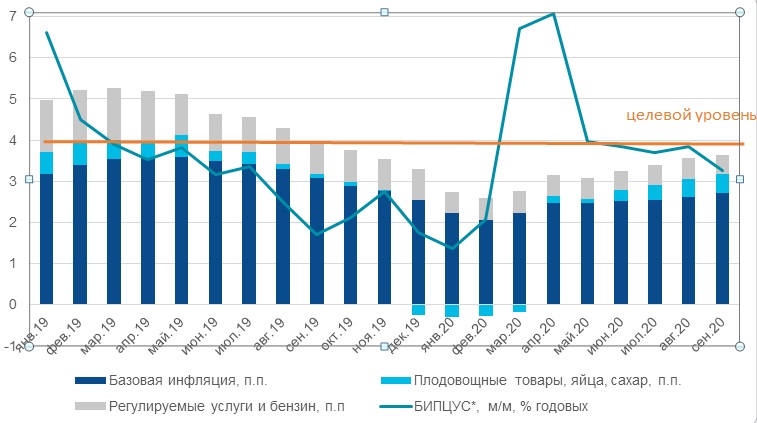 Текущий рост цен, с исключением динамики цен на плодоовощную продукцию, яйца и сахар, услуг ЖКХ и ряда других позиций, а также сезонности, в сентябре продемонстрировал замедление до 0,27% м/м (3,3% в год. эквиваленте) после продолжительного периода стабилизации на уровне 0,31% м/м (3,8-3,9% в год. эквиваленте). Основной вклад в замедление инфляции оказали платные услуги и цены на продовольствие – вероятно на фоне низкого роста доходов населения. Рост цен на непродовольственные товары ускорился на фоне ослабления рубля. Несмотря на тот факт, что под влиянием наблюдаемого резкого роста цен на сахар и плодоовощную продукцию, инфляция по итогам 2020 года превзойдет целевой уровень Банка России, ее динамика в 2021 г. с высокой вероятностью будет демонстрировать замедление, спрогнозировал старший экономист банка "Открытие".