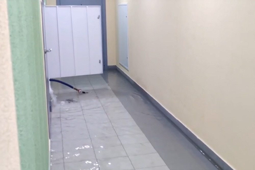 В частности говорится о том, что вода хлынула в коридоре одного из домов жилого комплекса по ул. Мечтателей. Затопило этаж. Также сообщается, что дом был сдан в декабре 2020 года.