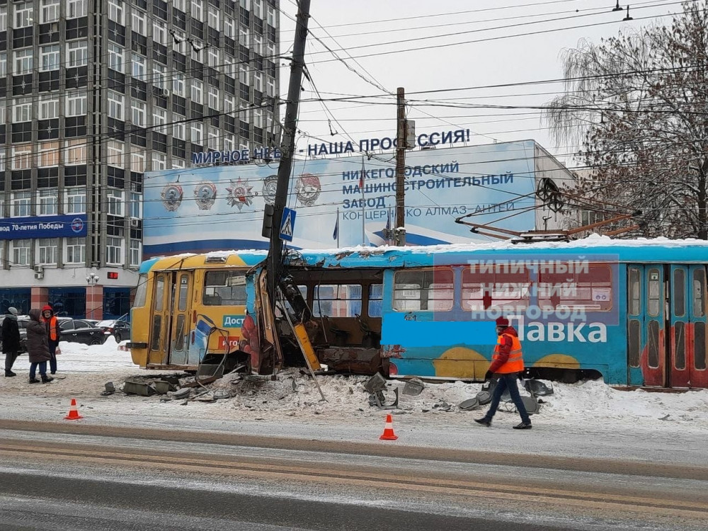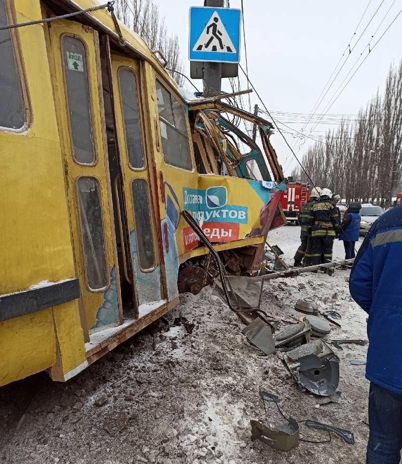 Напомним, трамвай не только сошел с рельсов, но и врезался в столб. Транспорт двусоставный, в столб врезалась его вторая часть.