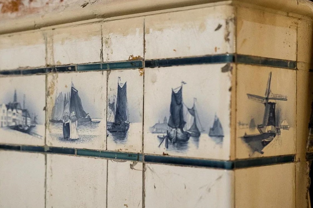 На полу - это плитка второй половины 19 века немецкого производителя Villeroy, на стенах — изразцы с бытовыми "голландскими" сюжетами.