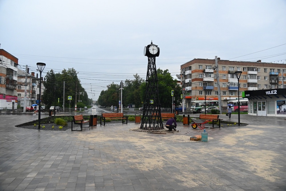 Кроме того, в центре Привокзальной площади появилось два арт-объекта - часы в форме Шуховской башни и декоративный паровоз. В настоящее время подрядчики устраняют недоработки на объекте и убирают строительный песок с брусчатки.