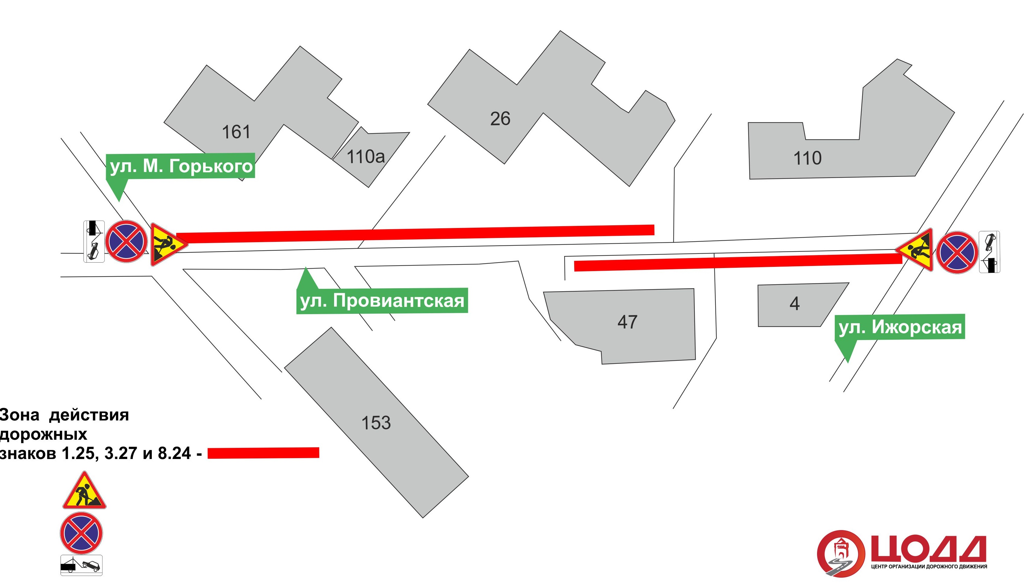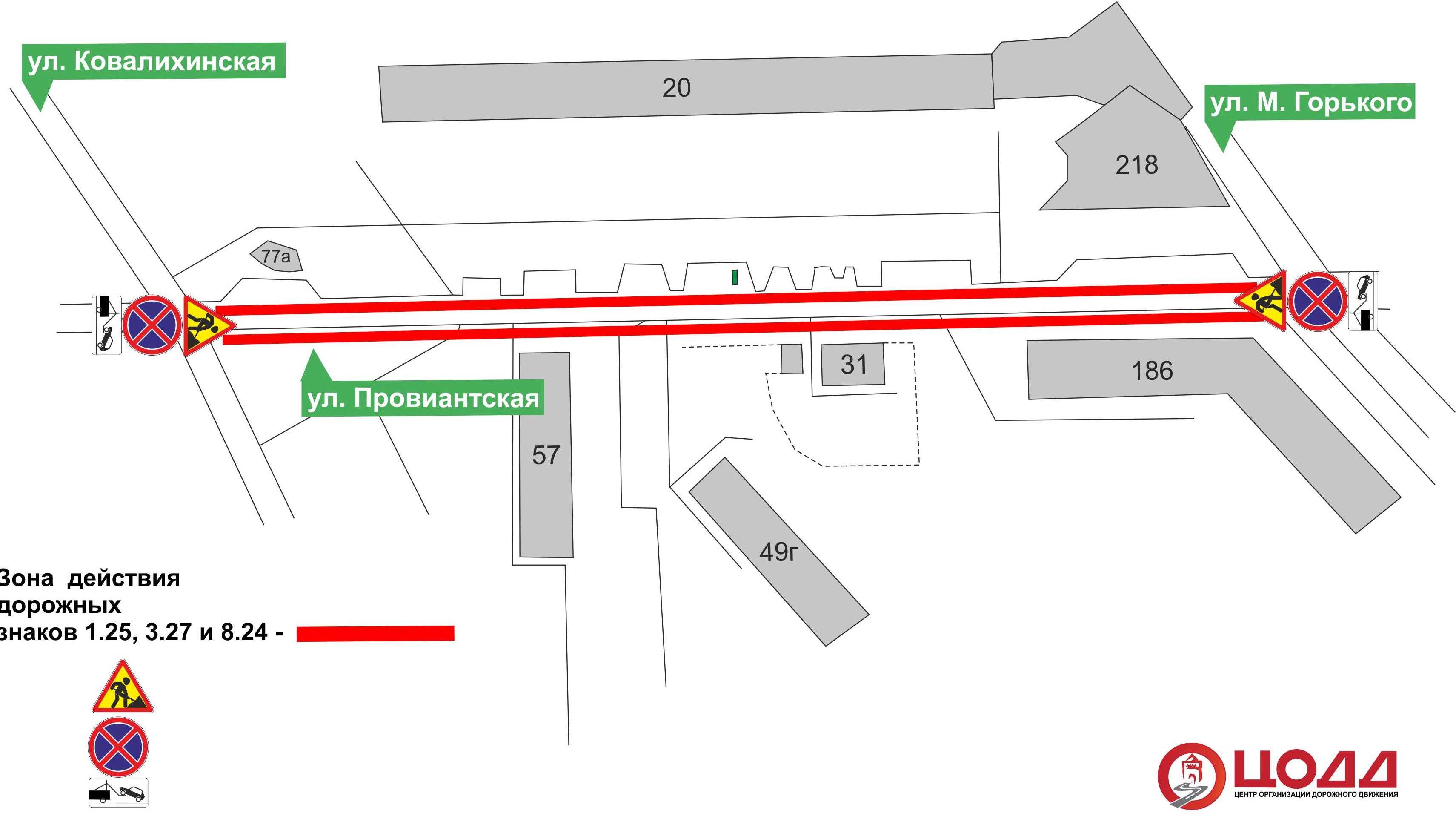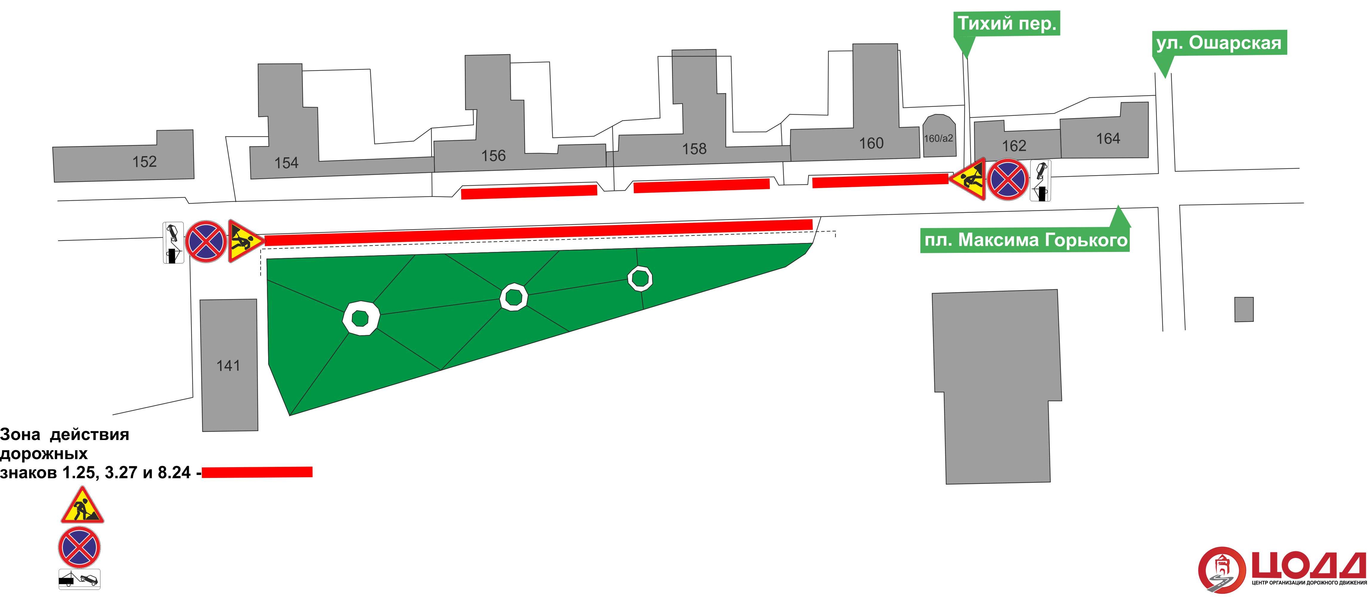 - на ул. Максима Горького - на участках дороги от дома №162 до дома №154;