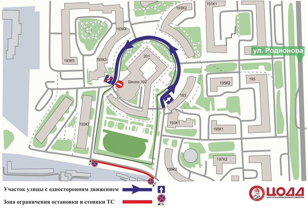 Кроме того, для беспрепятственного движения автомобилей будет запрещена остановка и стоянка транспортных средств на одной стороне улицы Родионова на участке от дома №193 корп. 7 до дома №199 корп. 2.