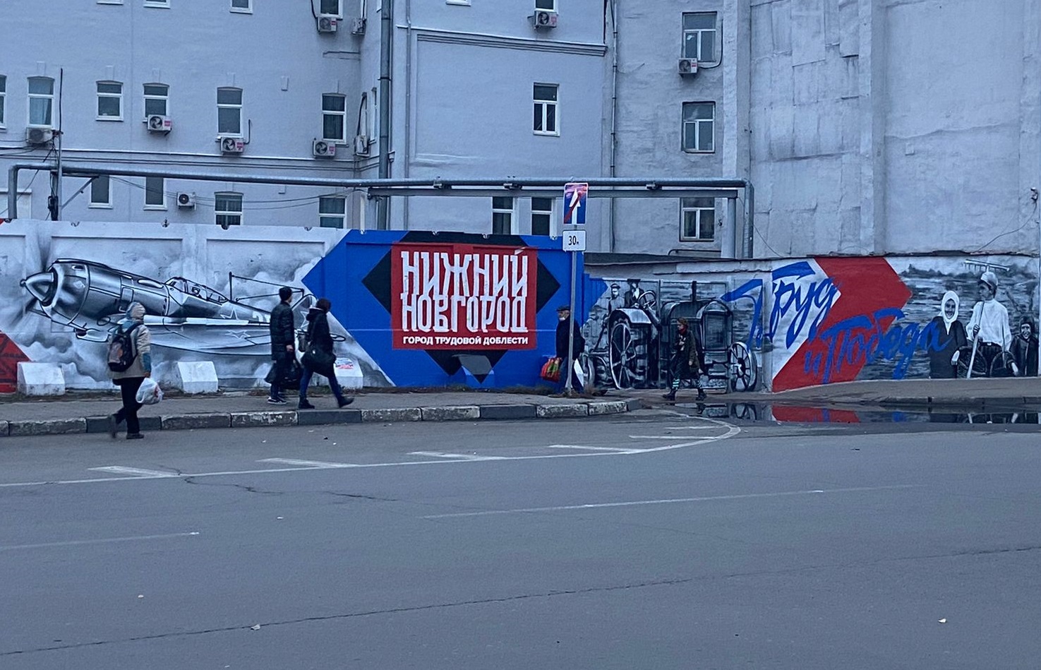Граффити создано в рамках марафона "Победный сентябрь", направленного на популяризацию вклада горьковчан-тружеников тыла и ведущих промышленных предприятий региона в общую Победу.