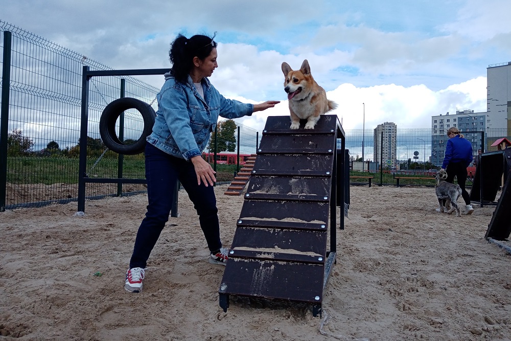 В зоне выгула собак размещены различные тренажёры - качели, барьеры, лабиринты и другие, а также установлены дог-диспенсеры.