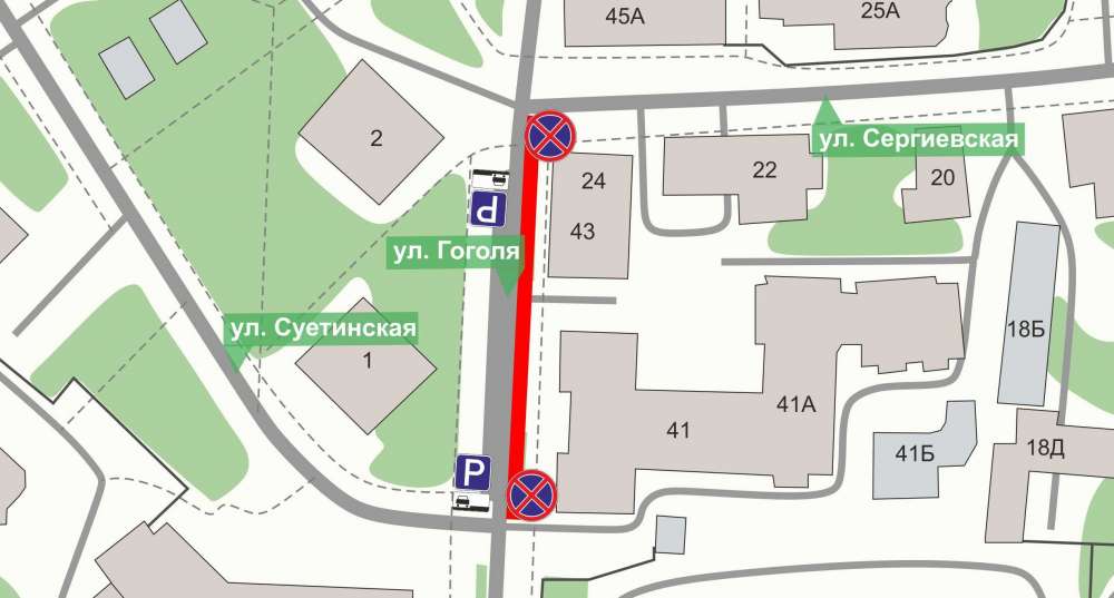 Согласно информации, запрет на остановку и стоянку автомобилей будет введен на участке улицы Гоголя от улицы Суетинской до улицы Сергиевской на правой стороне по ходу движения транспорта.