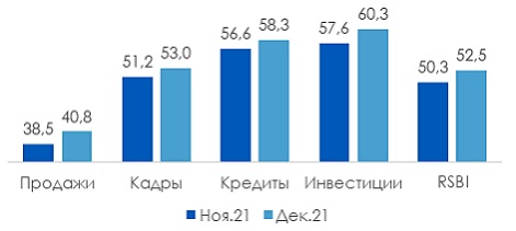 Согласно Индексу RSBI, который в декабре 2021 года составил 52,5 пункта, малый и средний бизнес отыграл спад предыдущего месяца, о чем свидетельствует рост всех компонент Индекса, в том числе обновление исторических максимумов инвестиционной деятельности и пиковые значения кредитной составляющей.