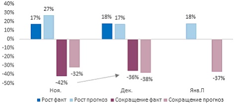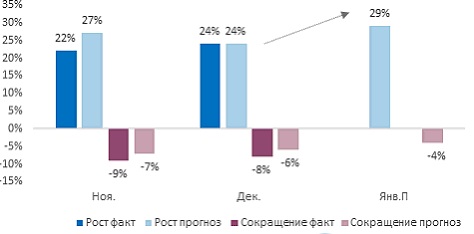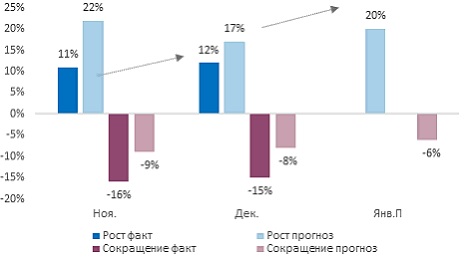 Доля МСБ, сокративших штат в декабре, вновь несколько снизилась - до 15%, что является минимумом с марта 2020 года. Количество тех, кто нанимал новых сотрудников, практически не изменилось и в декабре составило 12%. В ближайшие три месяца нанимать новых сотрудников будут 20% МСБ, что на 3% больше, чем месяцем ранее, а сокращения сотрудников планируют на 2% меньше – таких 6% об общего числа респондентов.