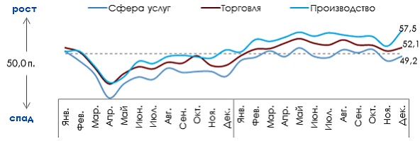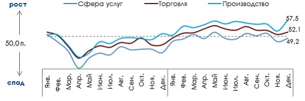 Индексы всех сфер деятельности также выросли в декабре, при этом показатели производства обновили исторический максимум - индекс составил 57,5 п., превысив майский пик в 57,1 п. Рост показателей МСБ в производстве связан с высокой доступностью кредитов и инвестиционной активностью предпринимателей. Сфера услуг все еще оказывается под давлением, индекс в декабре был ниже 50 п., как и в начале прошлого года.