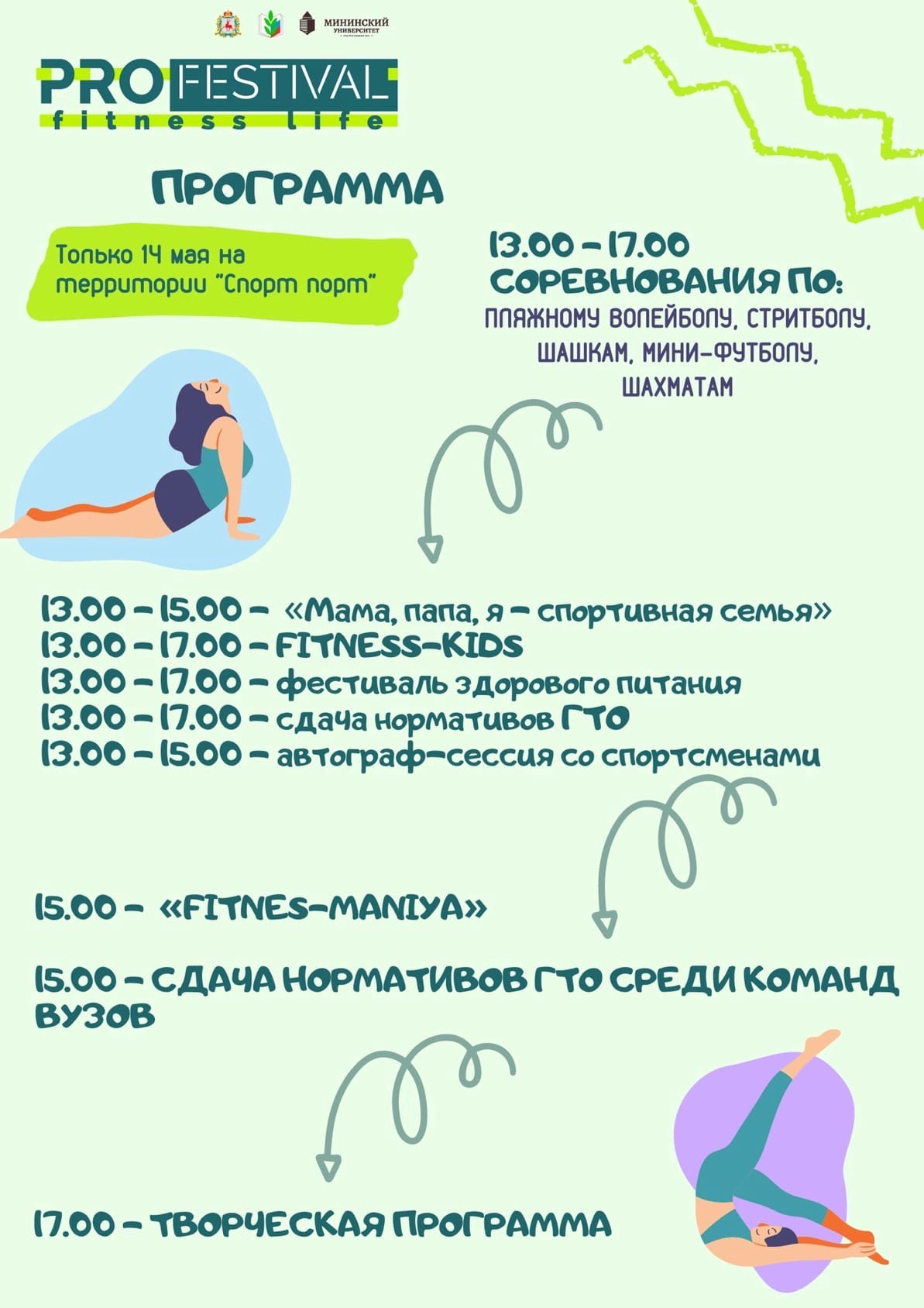 В Нижнем Новгороде на спортивно-развлекательной площадке "Спорт Порт" (ул.Бетанкура,1) 14 мая пройдёт областной фестиваль спорта и здорового образа жизни "PROфестиваль: fitness life". Он организуется для учащихся региональных вузов и активных жителей города.