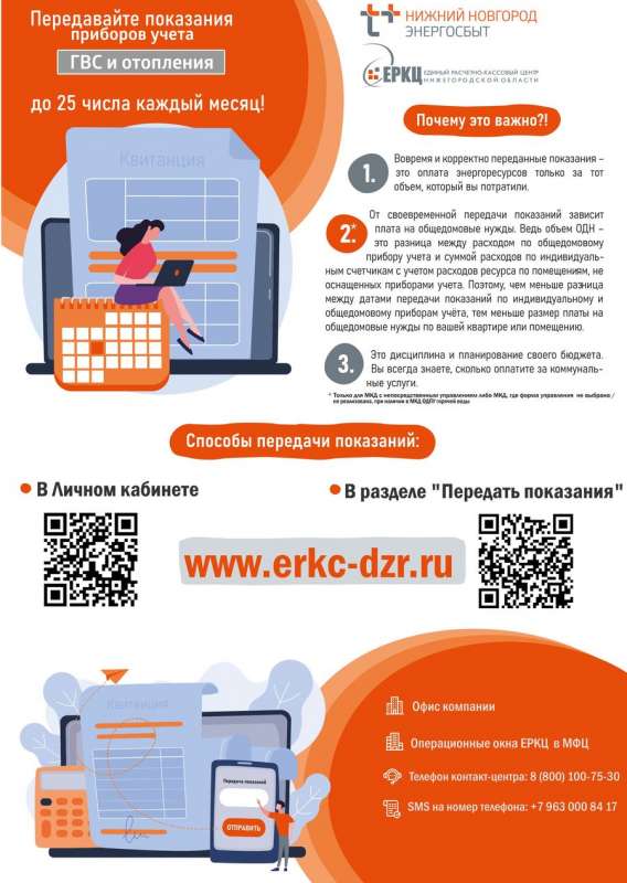 Также передать показания счетчиков можно по телефону Контакт-центра, направить смс-сообщение или обратиться в офисы ЕРКЦ, дополнительные операционные окна компании, расположенные в зданиях многофункциональных центров в Дзержинске и Кстове, в пункт приема платежей в ТД "Меркурий" (г.Дзержинск).