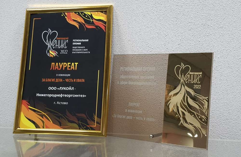 28 июля 2022 года в Нижнем Новгороде прошла торжественная церемония вручения Региональной премии общественного признания в сфере благотворительности "Нижегородский Феникс-2022". ООО "ЛУКОЙЛ-Нижегороднефтеоргсинтез" (100% дочернее предприятие ПАО "ЛУКОЙЛ") стало лауреатом в номинации "За благие дела – честь и хвала".