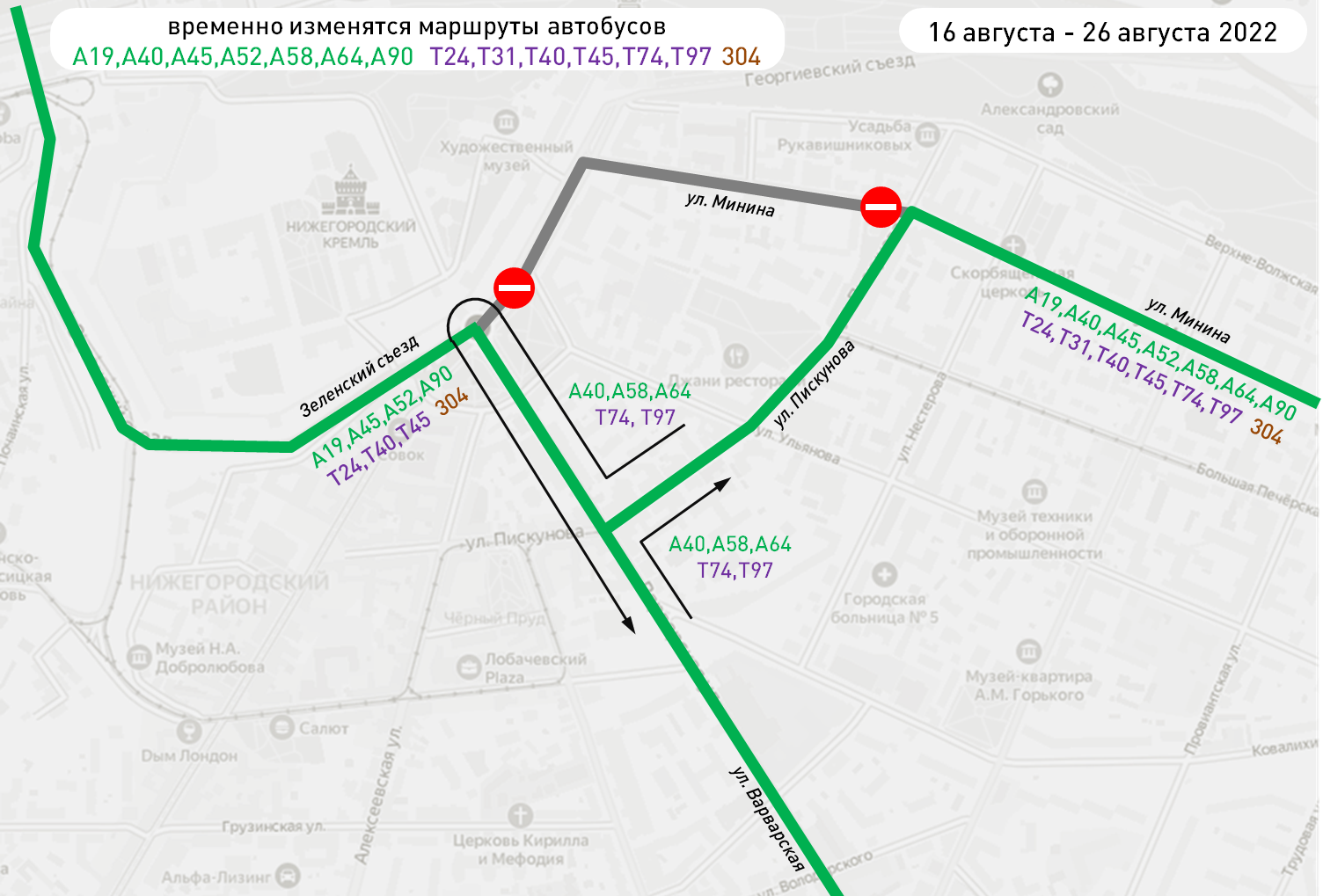 Маршруты А-40, А-58, А-64, Т-74, Т-97 будут проходить в направлении пл.Сенной – по ул. Пискунова, в направлении пл.Свободы – по ул.Пискунова и Варварской, пл.Минина и Пожарского и снова по ул.Варварской.
