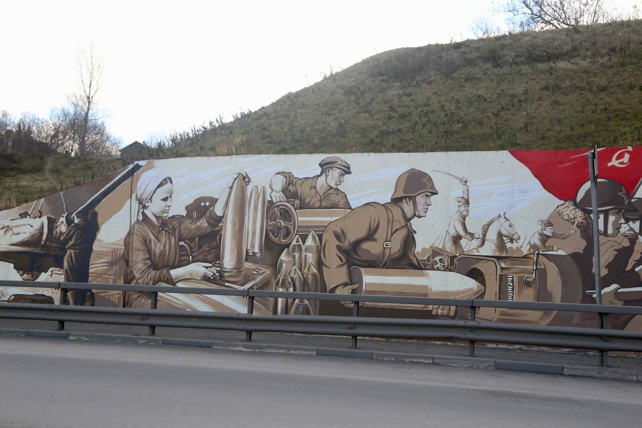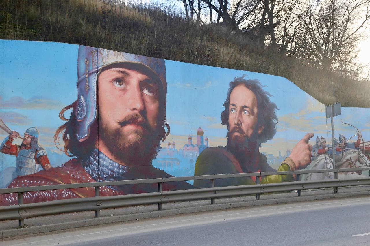 Как отметил глава города, на граффити изображены три значимых периода в истории Нижнего Новгорода и Горького: ополчение Минина и Пожарского, Великая Отечественная война и современность, создаваемая образами стадиона и Стрелки.