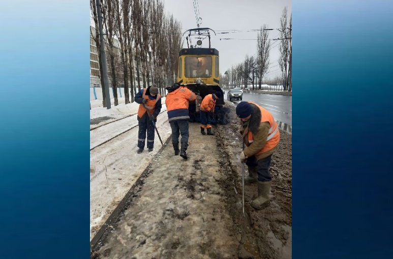 Согласно информации, сейчас проходит уборка снега на отремонтированных трамвайных путях.