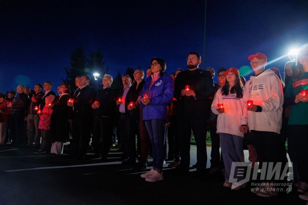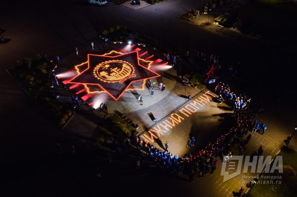 В ночь с 21 на 22 июня в парке Победы в Нижнем Новгороде появилось изображение памятного знака "Трудовая доблесть России" как символа Города трудовой доблести. Его создали из 10 тысяч свечей. Рядом с ним зажгли надпись "Нижний помнит".