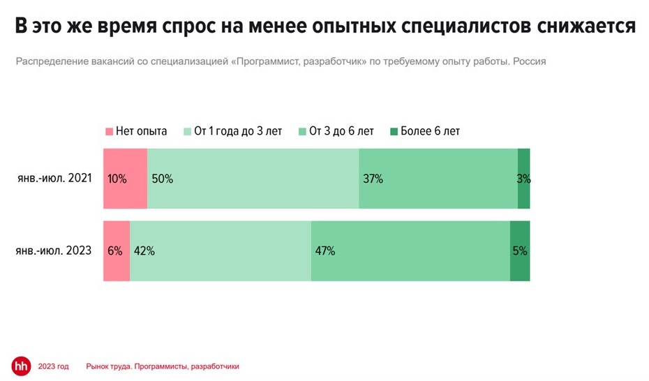 При этом наличие высшего образования не входит в число важных параметров для найма, его отмечают в вакансиях лишь 19% работодателей. Сейчас IT-компании используют skills-based-подход. То есть важен не опыт, а навыки, которые специалист у себя развил. В общем, свои компетенции все равно придется доказывать.