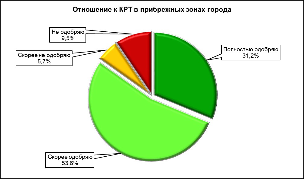 Исследование акцентирует на том, что часть проектов комплексного развития территорий включает застройку прибрежной территории. В соответствии с результатами опроса, суммарно 84,8% жителей Нижнего Новгорода положительно относятся к развитию прибрежных территорий. Общая доля респондентов, отрицательно относящихся к жилой застройке прибрежной зоны города – только 15,2% от числа опрошенных.