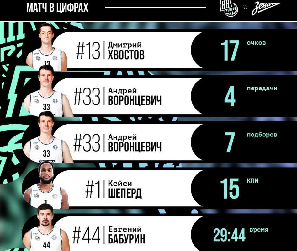 Больше всего очков за игру принёс Дмитрий Хвостов — 17. Андрей Воронцевич отметился в четырёх передачах и семи подборах. Кейси Шеперд признан лучшим по КПИ. Больше всего времени на площадке провёл капитан команды Евгений Бабурин — 29:44.