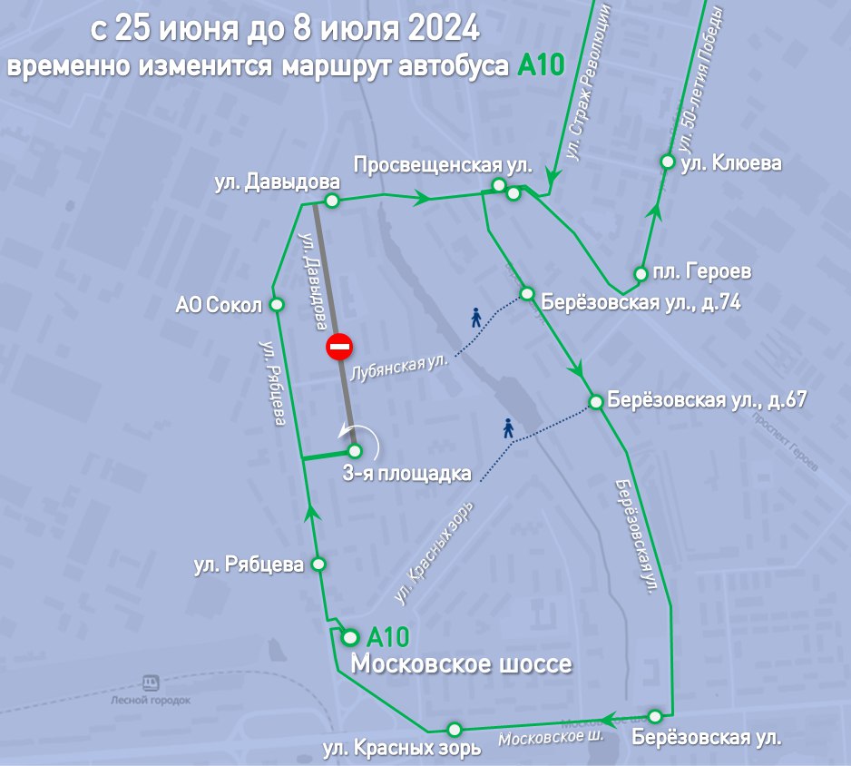 Кроме того, автобусы А-10 будут следовать по скорректированному маршруту. В частности, движение будет организовано в объезд перекрытия по участку от Просвещенской улицы до конечной остановки "Московское шоссе" – по Берёзовской улице, Московскому шоссе и улице Рябцева.