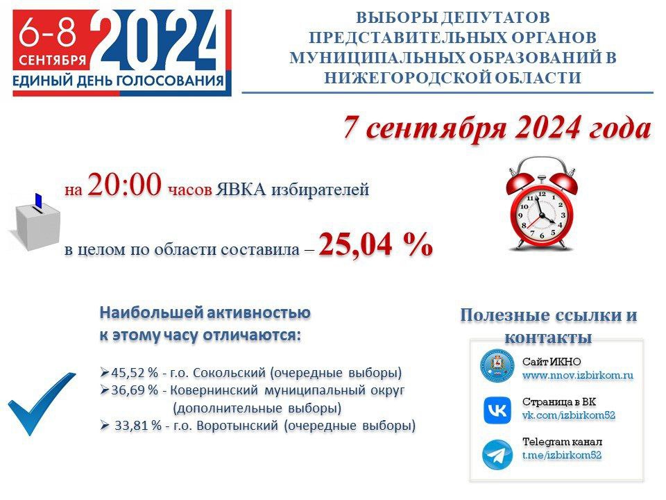Ровно в 20:00 по местному времени все 92 избирательных участка, задействованных на муниципальных выборах в ЕДГ 2024 на территории Нижегородской области, закрылись для голосования избирателей.