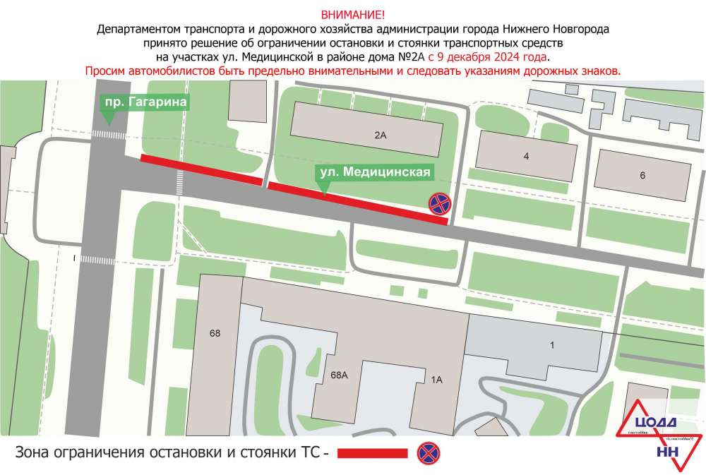 В Нижнем Новгороде с 9 декабря на участках улицы Медицинской в районе дома №2А будет введено ограничение на остановку и стоянку транспортных средств.