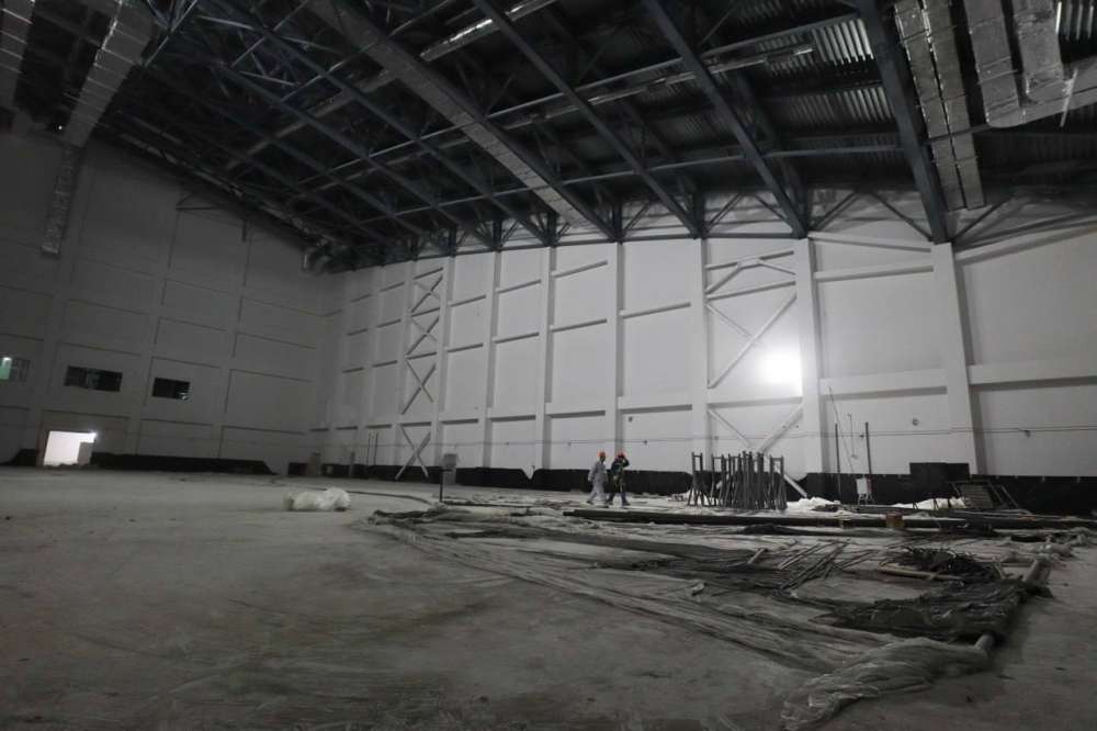 На данный момент в спорткомплексе завершены работы по устройству фундамента для двух тренировочных площадок, идет установка ограждений и трибун на главной арене, а также близится к завершению монтаж эскалаторов.
