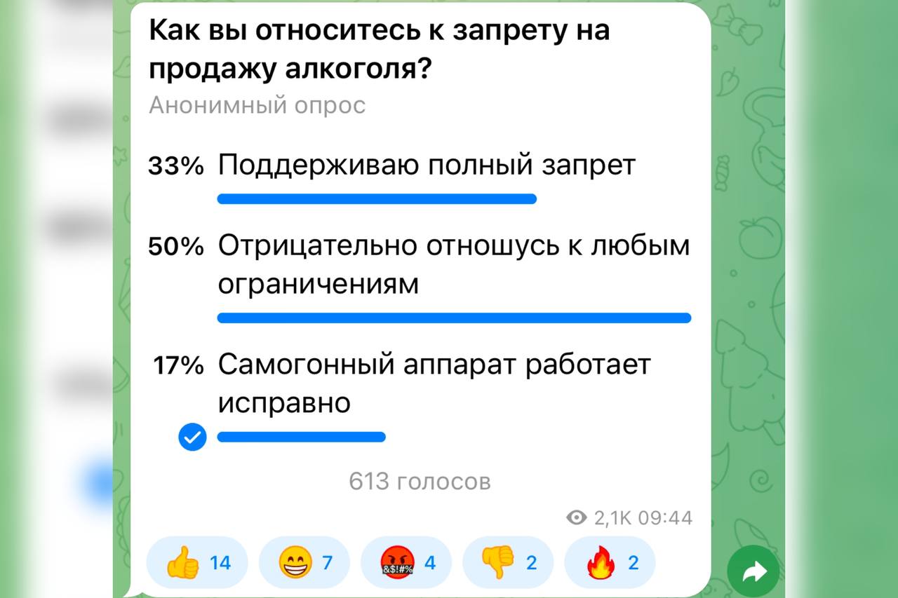 Голосование, стартовавшее 16 апреля, собрало более 600 участников. Из них 50% высказались против любых ограничений на продажу спиртного. Полный запрет поддержали 33% респондентов. Ещё 17% выбрали ироничный вариант ответа: "самогонный аппарат работает исправно".