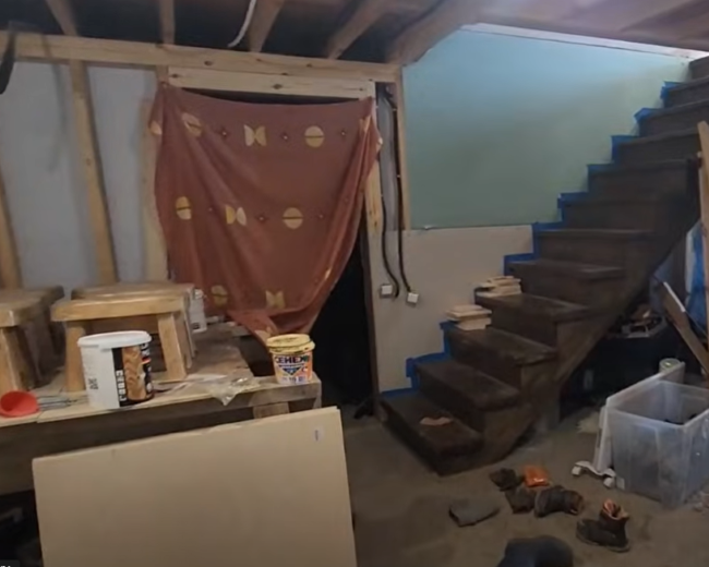 В подвале находится временная рабочая мастерская. В будущем ее планируют перенести в другое место. Также здесь отделены пространства для дополнительных спален.