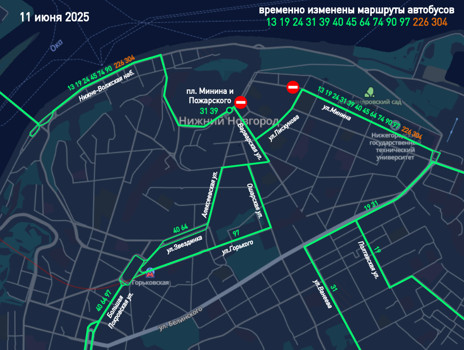 В пресс-службе городской администрации отметили, что 11 июня с 00:01 до 23:59 будет закрыт проезд по площади Минина и Пожарского — на участке от улицы Варварской до Верхневолжской набережной.